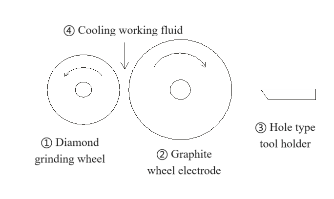 ② Grafithjulselektrode: Brug et grafithjul, der er let at behandle som en elektrode, anvende princippet om udladningsbearbejdning og brug en elektrisk gnist til at fjerne den del af diamantslibningshjulet, der skal behandles. Det ydre hul på grafithjulet drejes og dannes af et hulskærer, der er fastklemt på værktøjsholderen.